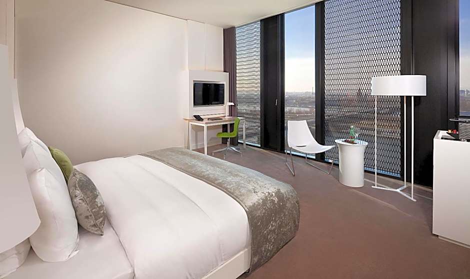 Fitted with floor-to-ceiling windows and cutting-edge technology, these spacious and modern double rooms feature a seating area and amenities such as a flat-screen TV, a safe, a mini-bar (surcharge), and a Nespresso coffee machine (with 2 free capsules per day). The bathroom comes with a rain shower, a hairdryer and free toiletries, and most of the bathrooms furthermore have a bath tub."