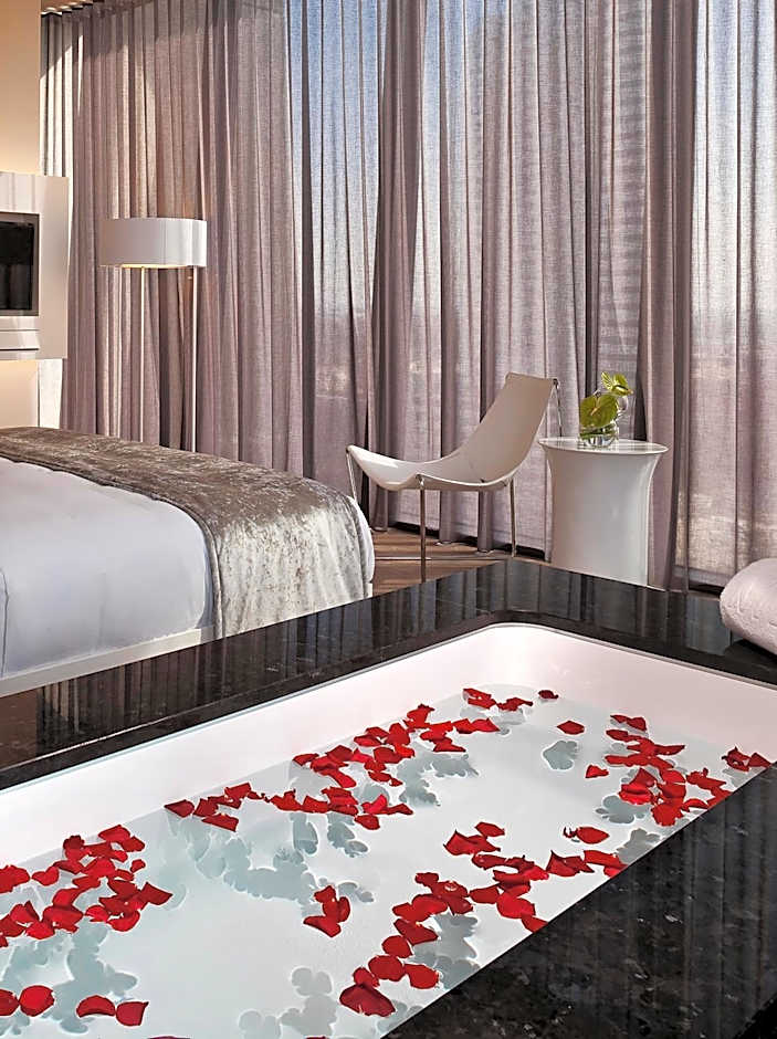Upon arrival, a bottle of sparkling wine and chocolate-covered strawberries are provided.